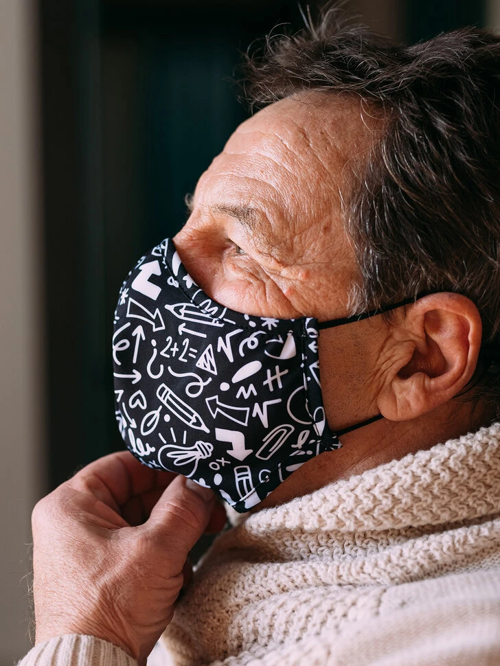Kritzelst du gerne alle erdenklichen Bilder und Formen? Menschen, die kritzeln, sind angeblich weniger gestresst! Die lustige antibakterielle Gesichtsmaske voller Kritzeleien schützt deine Gesundheit und sorgt gleichzeitig für gute Laune.