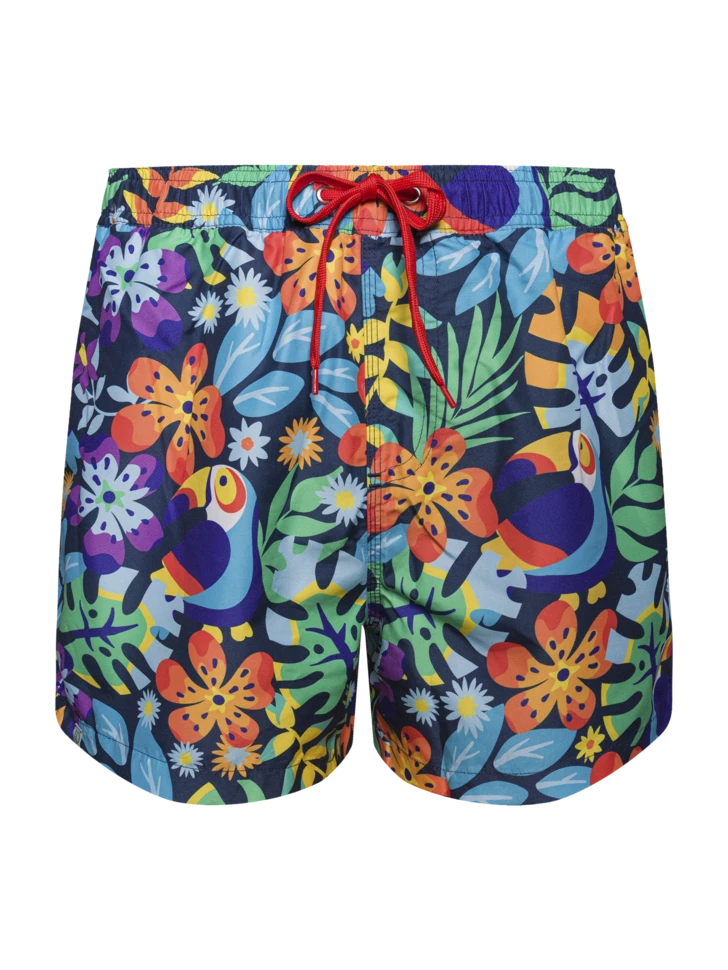 Fahr in den Urlaub in tropische Länder. Wie? Mit unseren lustigen Badeshorts für Männer! Und vergiss nicht, dir einen Fischerhut oder ein Strandtuch im gleichen Design für das perfekte Sommerset zuzulegen.