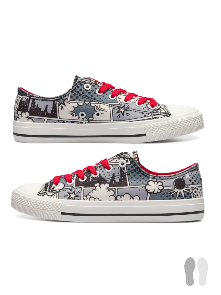 Obwohl der Comic auf diesen lustigen Canvas-Schuhen in Schwarz und Weiß gehalten ist, werden deine Tage dank dieser Sneaker ganz sicher nicht schwarz und weiß sein. Ganz im Gegenteil, das atmungsaktive Material gibt dir eine unendliche Dosis an Komfort und bereitet dir mit seinem verspielten Design bei jedem Schritt Freude. Vergiss nicht, sie mit deiner besseren Hälfte zu kombinieren!
