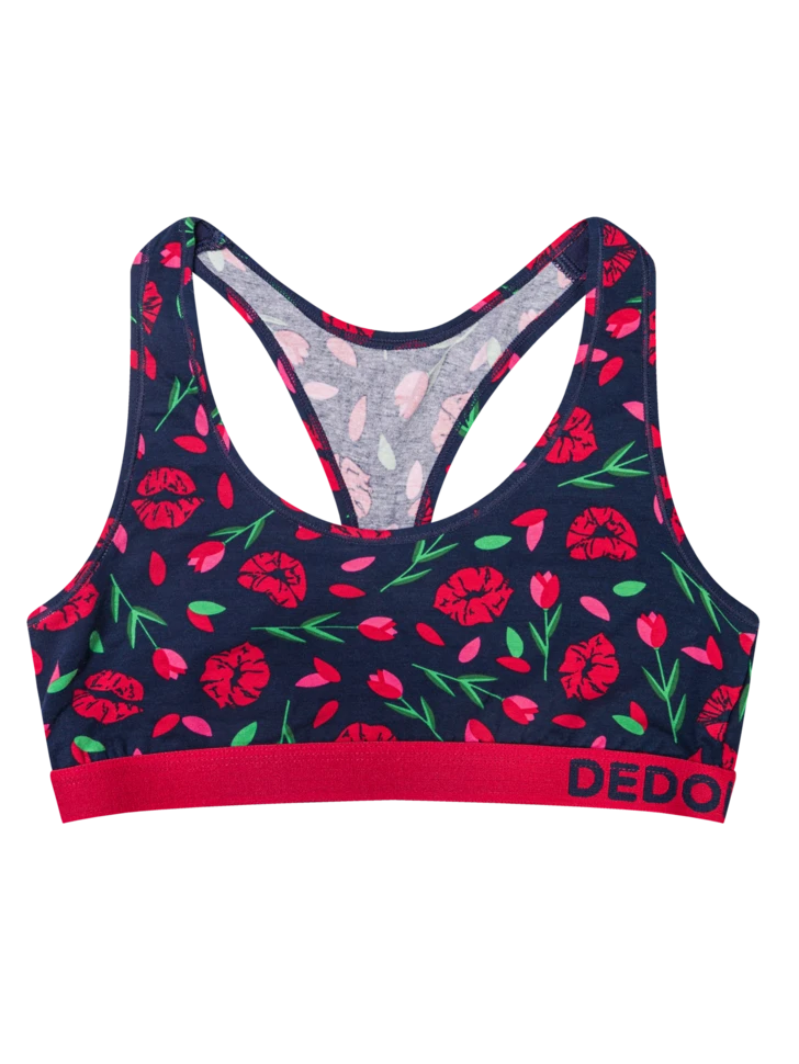 Tulpen, die im Frühling ihre Knospen zeigen, blühen nur eine Woche lang. Ihre Schönheit ist so kurzlebig wie ein Kuss. Keine Sorge, die lustige Damenbralette mit dem Motiv deiner Lieblingsblumen bereitet dir zu jeder Jahreszeit Freude.