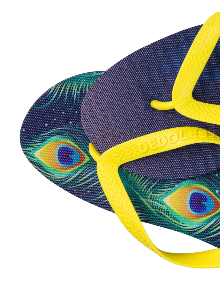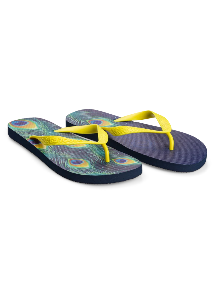 Wusstest du, dass es bis zu drei Jahre dauert, bis einem Pfau sein majestätischer Schwanz wächst? Du kannst seine wunderschönen Federn ab jetzt auch an deinen Füßen bewundern. Bereite dir mit lustigen Flip-Flops mit einem bunten Pfauen-Tanz-Motiv eine Freude.