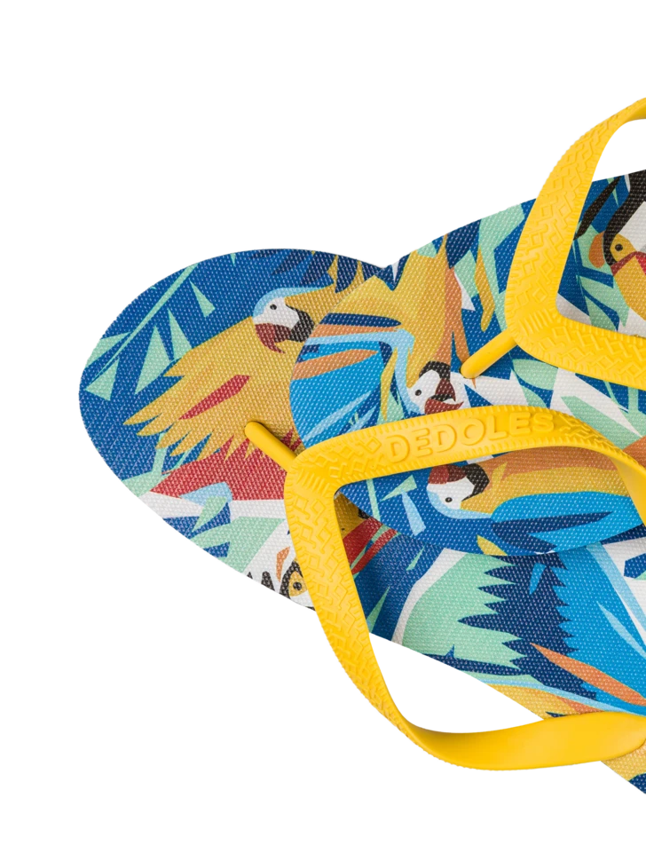 Wusstest du, dass ein blaugelber Ara bis zu 800 menschliche Wörter lernen kann? Dieser intelligente und wunderschöne Vogel schmückt zusammen mit dem Tukan lustige Flip-Flops, die in allen tropischen Farben leuchten. Fliege mit den originellen Sommerschuhen in exotische Länder.