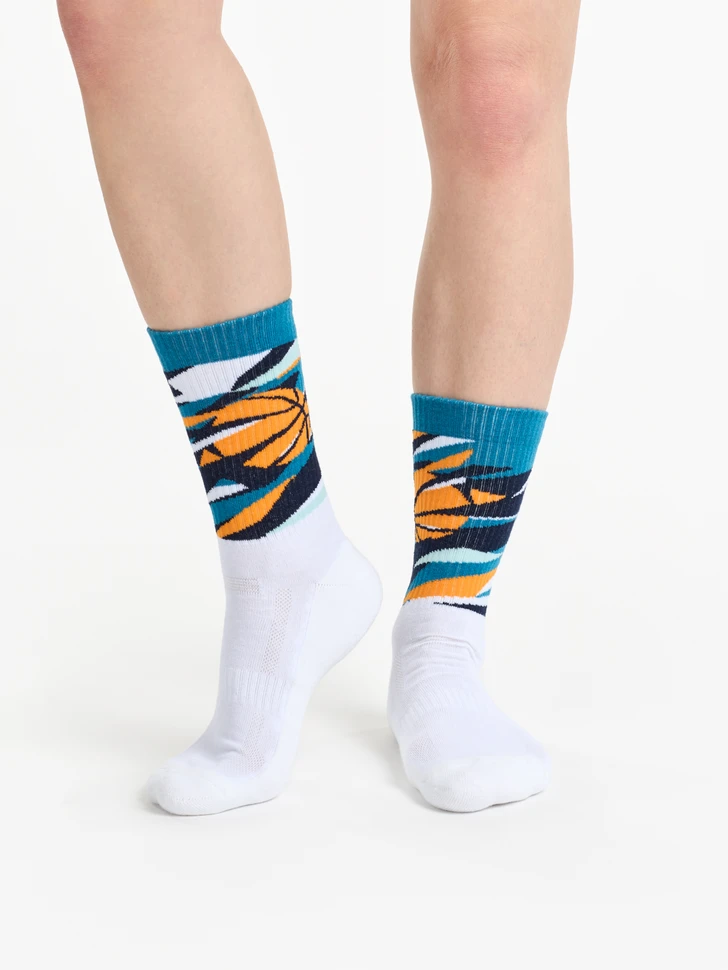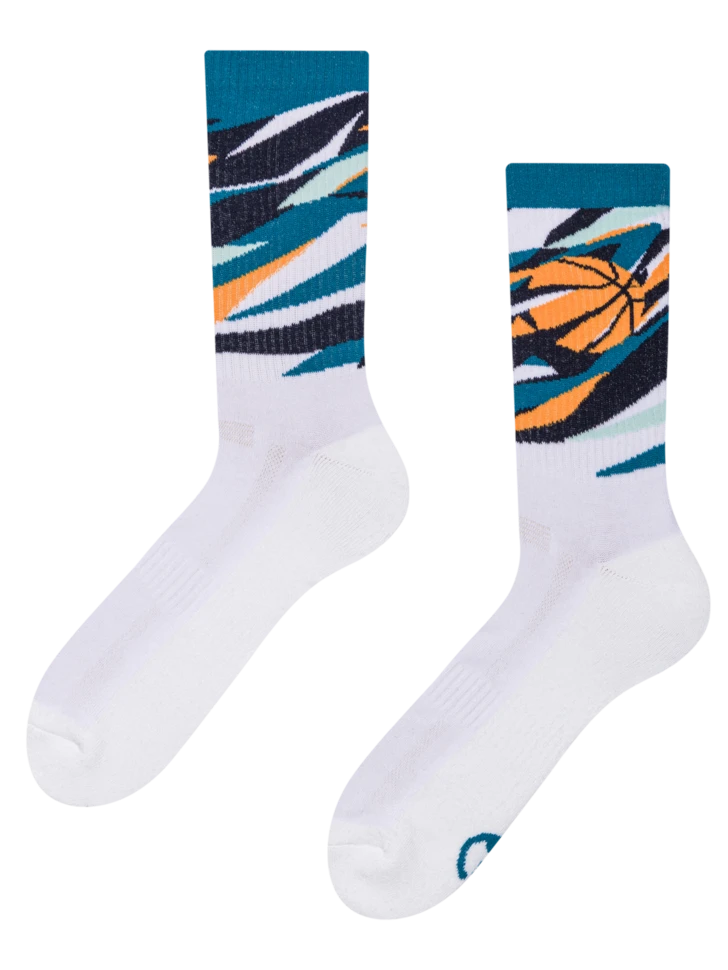Wusstest du, dass Basketbälle früher braun waren? Heute sind sie orange, damit Spieler und Zuschauer sie gut sehen können. Sorge mit lustigen funktionellen Socken, die Feuchtigkeit vom Körper wegleiten, dafür, dass dein Outfit nicht zu übersehen ist.