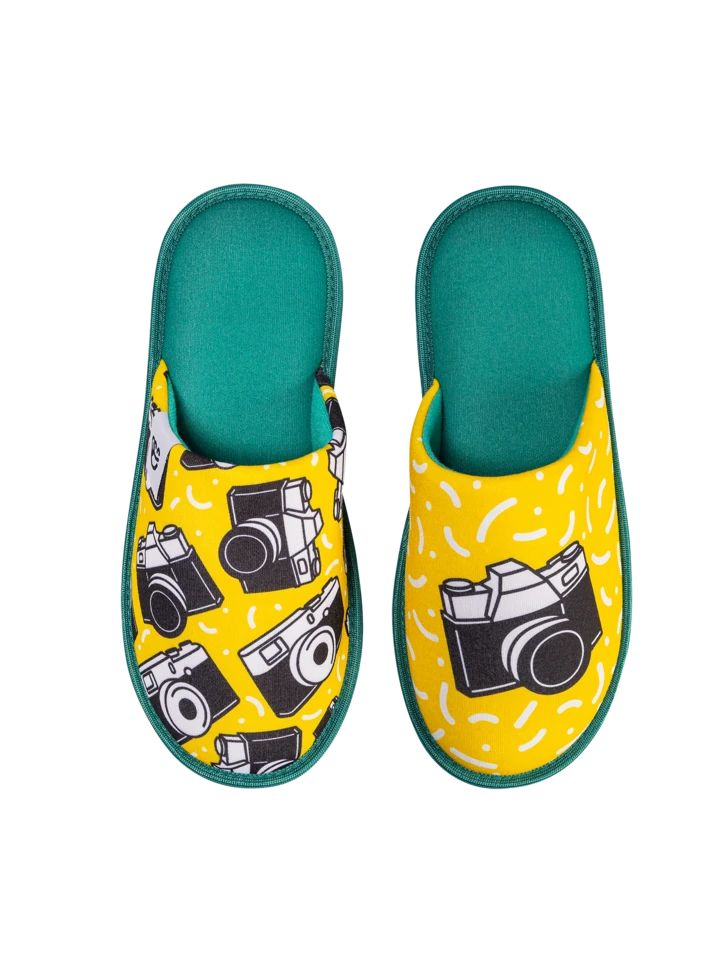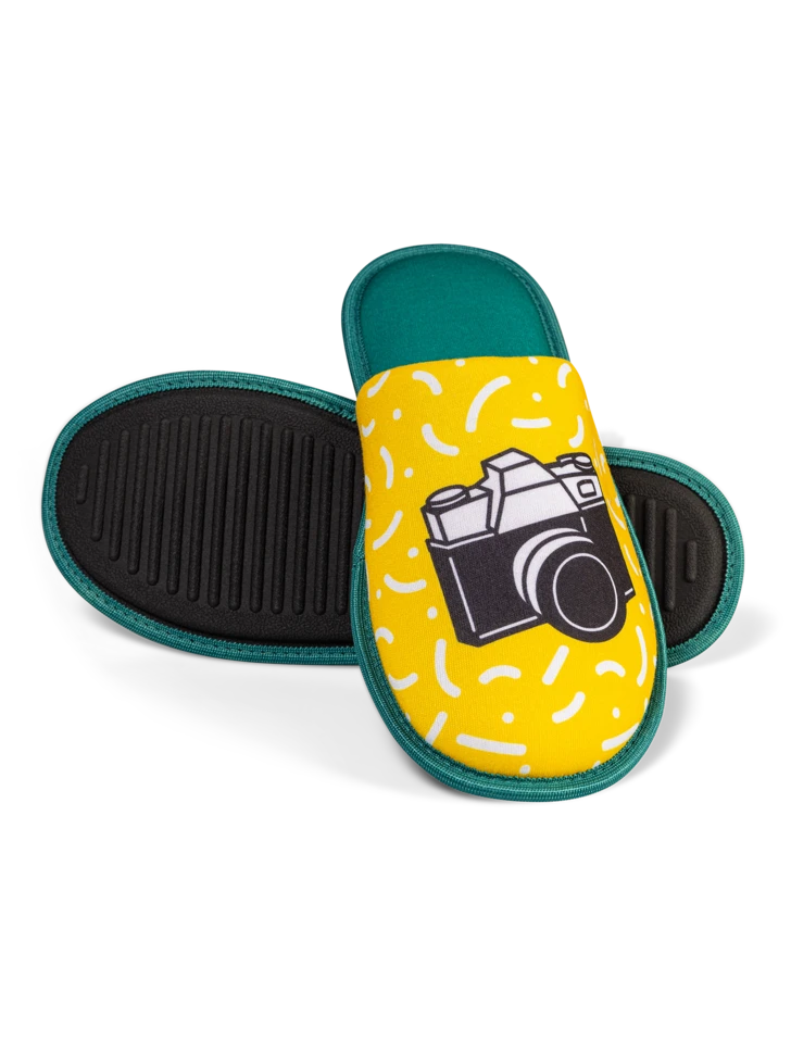 Dieses Paar lustiger Hausschuhe wurde für alle Fans der Fotografie gemacht. Wenn Fotografie deine Leidenschaft ist, dann hast du mit diesen Hausschuhen deine Kamera auf Schritt und Tritt dabei.