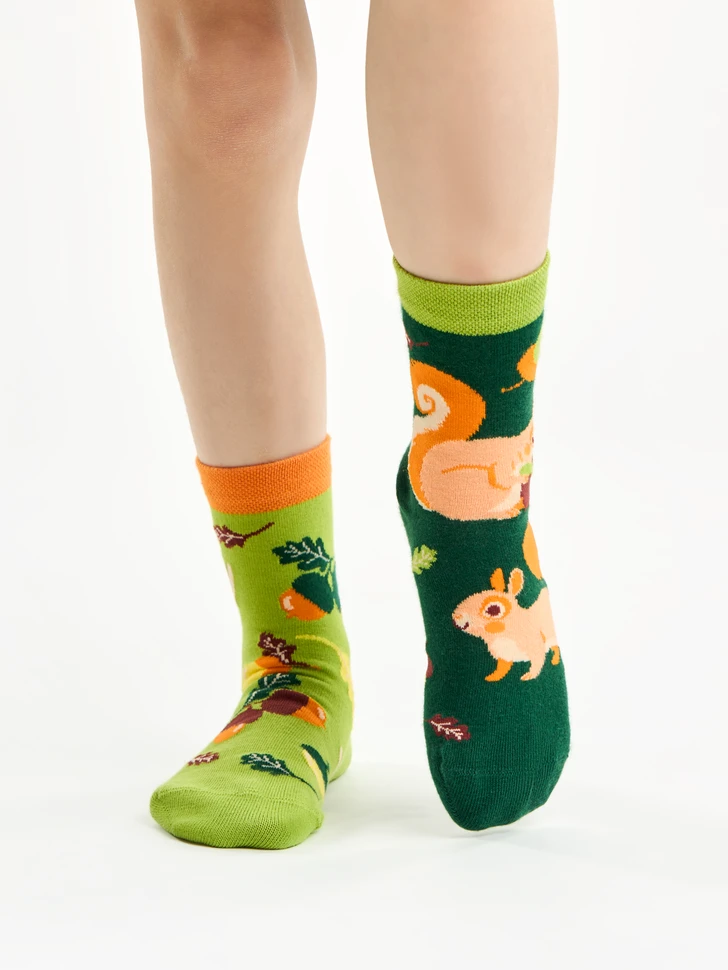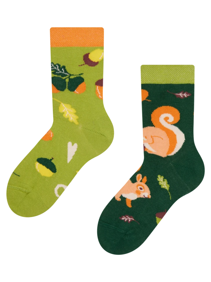 Eichhörnchen sammeln und lagern Nüsse, genau wie wir uns mit bequemer Kleidung eindecken. Wenn dein Kind ein neues Paar Socken braucht, sind diese lustigen Kindersocken genau das Richtige.