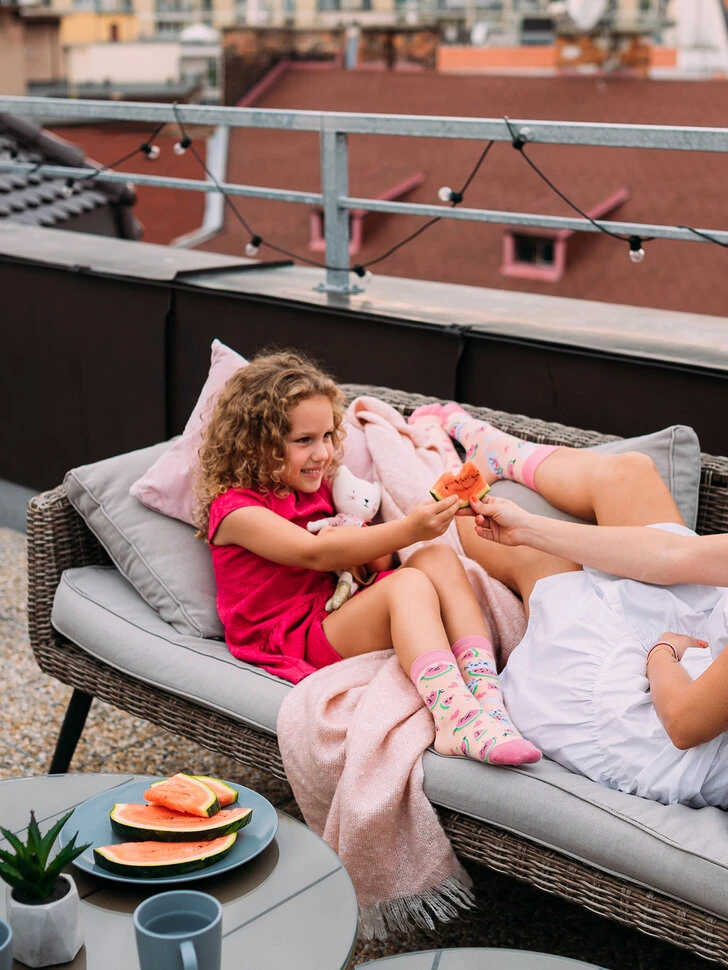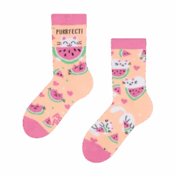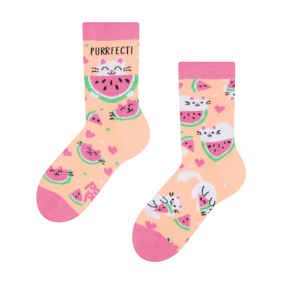 Katzen lieben alle Arten von Leckereien, aber mögen sie auch Wassermelonen? Verspielte Katzen auf den Kindersocken naschen fröhlich an einer süßen Wassermelone und zaubern den Kindern den ganzen Tag über ein Lächeln auf die Lippen.