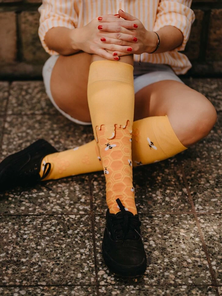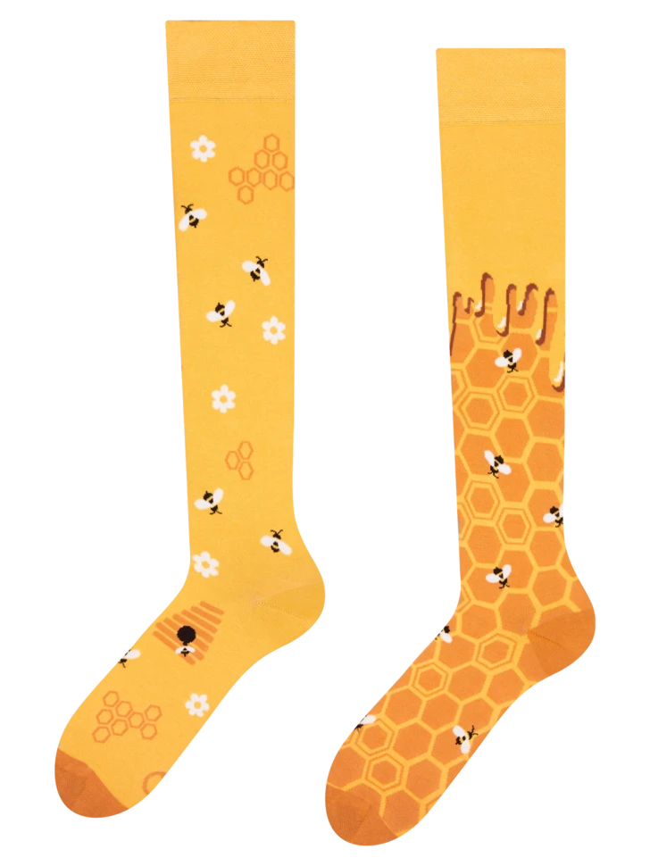 Die perfekte sechseckige Form von Wabenzellen ist ein Beweis für die ausgeprägte Arbeitsmoral der Bienen. Wenn du so fleißig wie eine Biene bist, dann sind diese lustigen Kniesocken genau für dich gemacht.