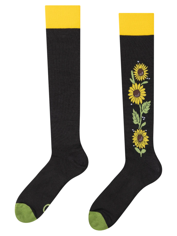 Was macht eine Sonnenblume nachts, wenn sie der Sonne nicht folgen kann? Finde es mit unseren lustigen Kniesocken heraus, die dein Outfit verschönern und deine Füße Tag und Nacht warm halten.