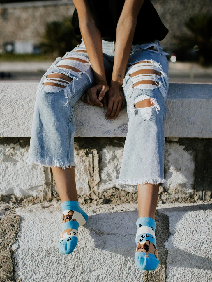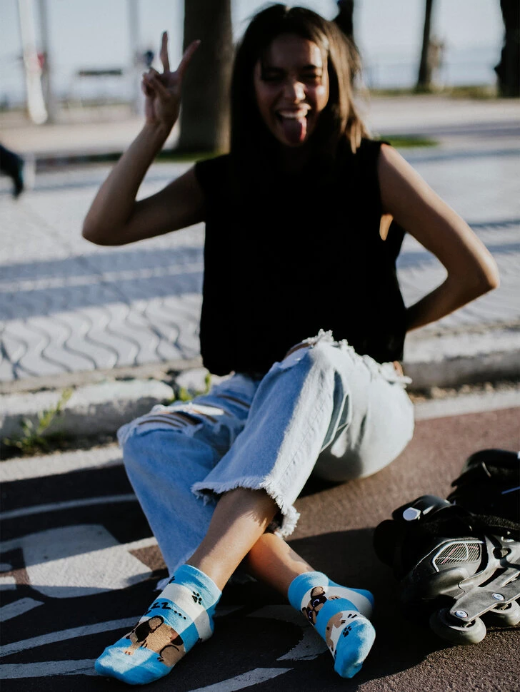 Hunde machen Menschen glücklicher. Einen Hund zu streicheln, kann nachweislich den Stresspegel einer Person verringern. Ziehe bunte, lustige Knöchelsocken mit Hundemotiv an und werde den Stress los.