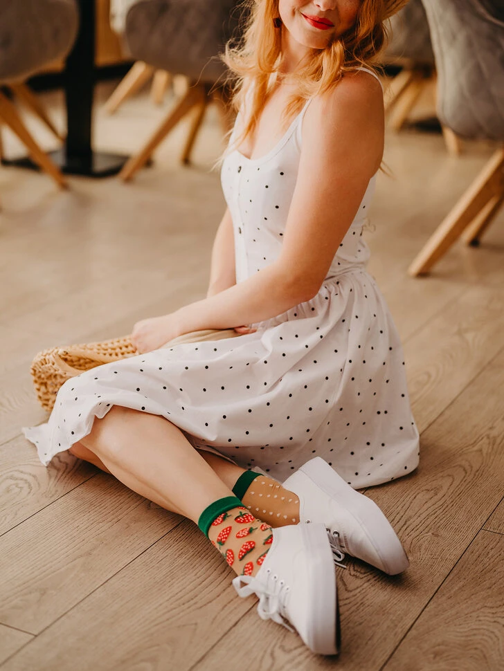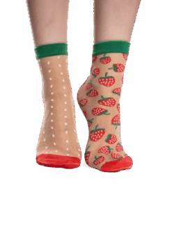 Süße rote Erdbeeren sorgen im Sommer für farbenfrohe Mahlzeiten. Unsere Nylonsocken mit Erdbeeren sorgen ebenfalls dafür, dass dein Outfit farbenfroher wird! Zwar enthalten sie keine Vitamine und werden dein Immunsystem nicht stärken, aber sie werden deine Stimmung total aufhellen!