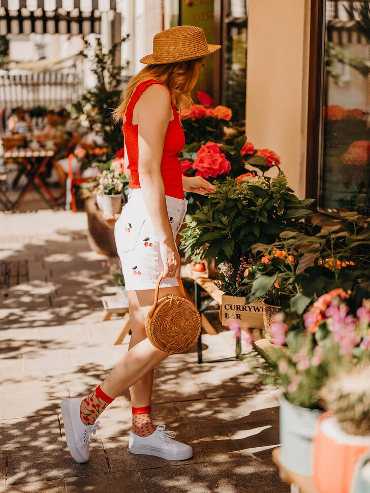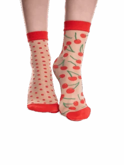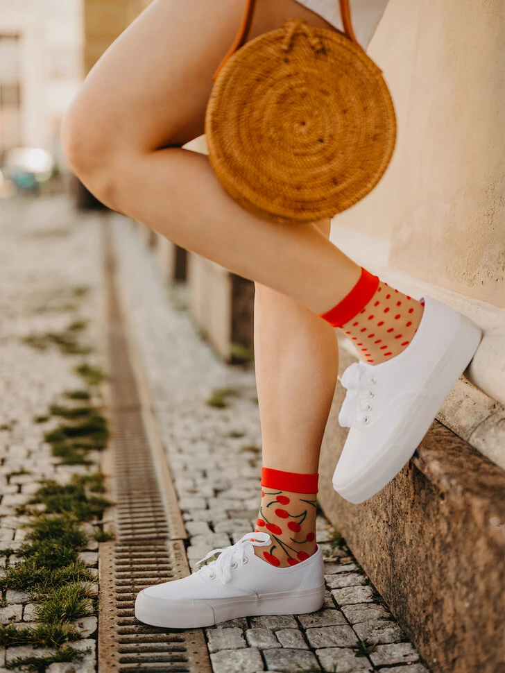 Wir haben uns als Kinder oft Kirschen an die Ohren gehängt und so getan, als wären es Ohrringe. Jetzt können wir sie uns an den Füßen aufsetzen, dank der bunten Nylonsocken Kirschen und Punkte, die für gute Laune im Alltag sorgen.