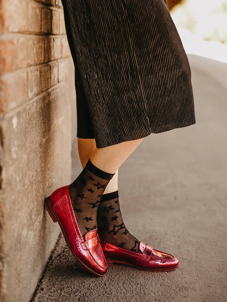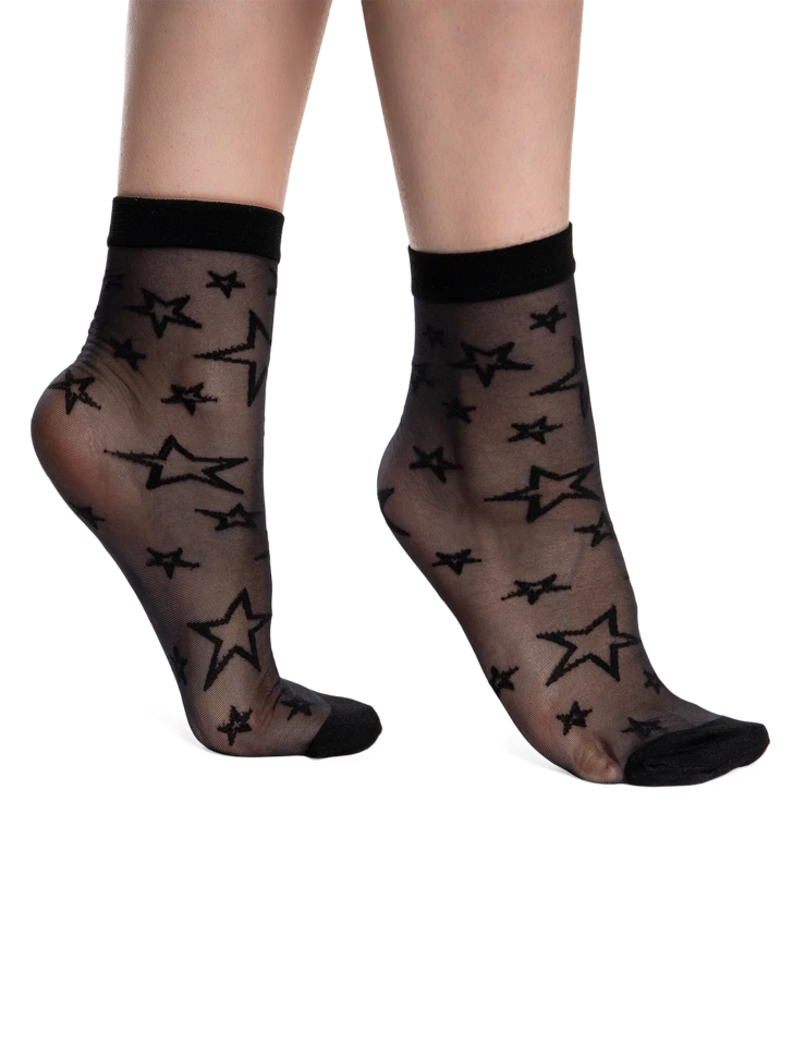Frische deinen Look mit diesen originellen Nylonsocken „Schwarze Sterne“ auf und lasse dein Lächeln heller strahlen als alle Sterne darüber.