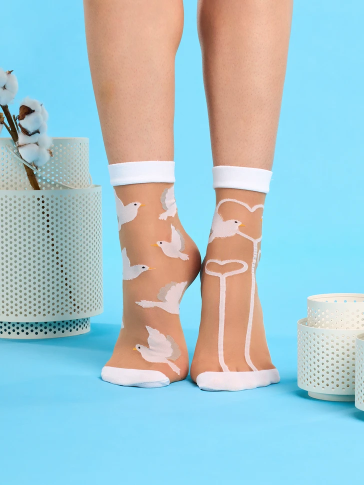 Weiße Tauben sind ein Symboldes Friedens und Liebe. Verbreiten Sie diese Botschaft weiter mit unseren fröhlichen Seidensocken, die nicht nur ein fantasievolles Muster haben, sondern werden auch aus hochwertigen Material hergestellt. Peppen Sie Ihr Outfit auf und seien Sie stilvoll!