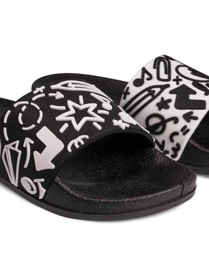 Wusstest du, dass Menschen, die kritzeln, angeblich weniger gestresst sind! Diese lustigen Pantoletten für Kinder voller Kritzeleien bieten deinem Kind Komfort und sorgen gleichzeitig für gute Laune.