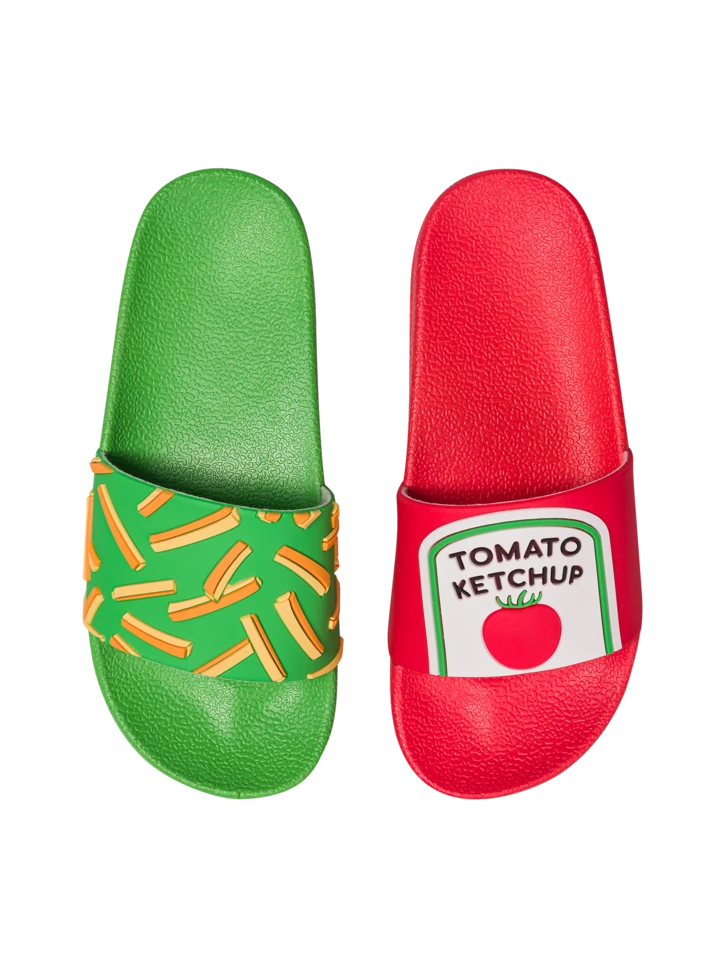 Pommes und Ketchup passen perfekt zusammen, genauso wie diese lustigen Pantoletten für Kinder. Jede ist anders, doch zusammen werden sie den Tag deines Kindes sofort aufheitern.