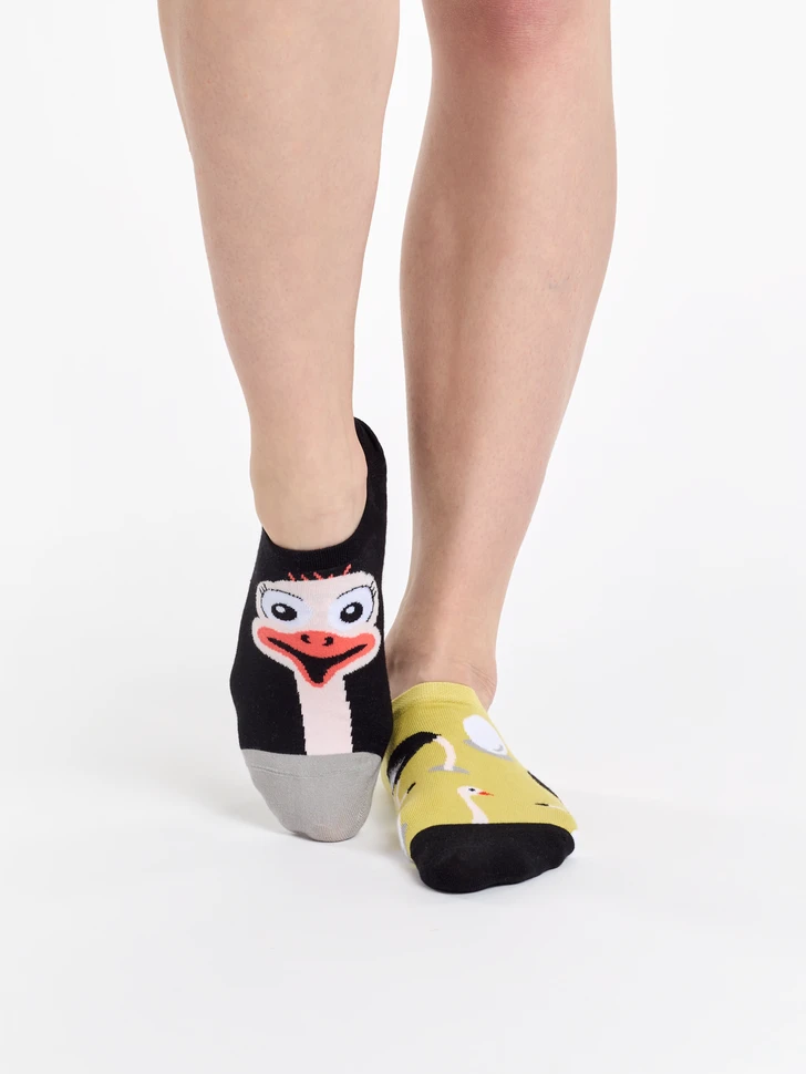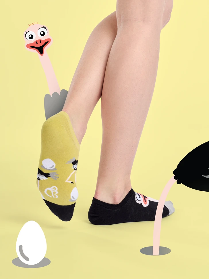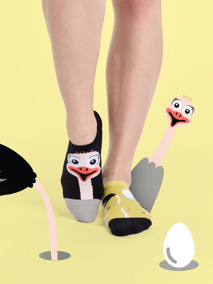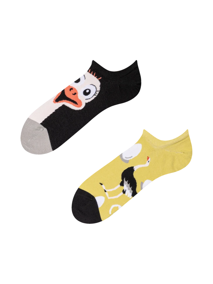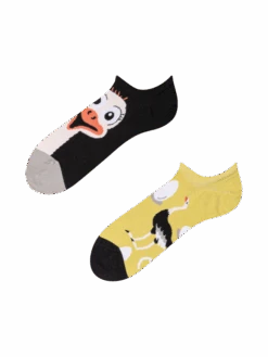 Wusstest du, dass ein Strauß bis zu 70 km/h schnell rennen kann? Er ist auch der größte lebende Vogel und kann zwar nicht fliegen, aber seine kräftigen Beine können ihn überall hin befördern. Zieh ein Paar der lustigen Sneakersocken mit Straußmotiv an und finde die Kraft, bis ans Ende der Welt zu gehen.