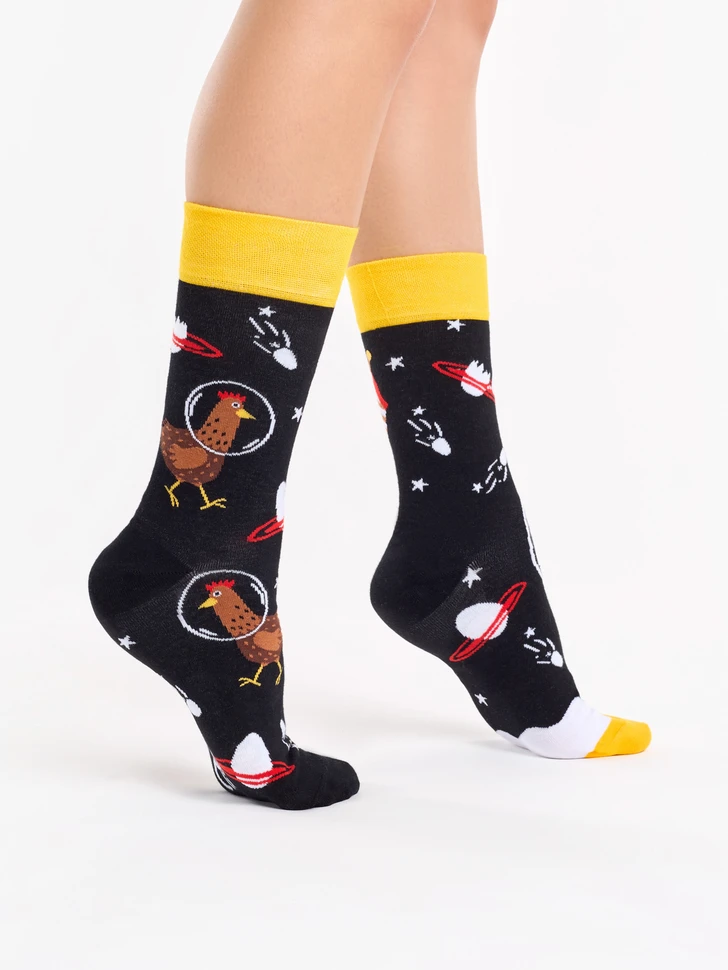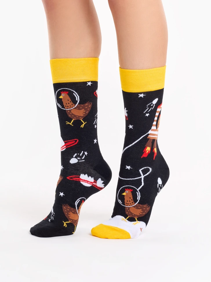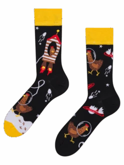 Wenn die Hündin Laika es geschafft hat, in den Weltraum zu fliegen, warum kann dann nicht auch ein Huhn ein Astronaut sein? Dieses fröhliche Muster findest du ab sofort auf unseren lustigen Socken. Verwöhne deine Füße mit einer Dosis Komfort mit diesen Socken aus hochwertiger Baumwolle.
