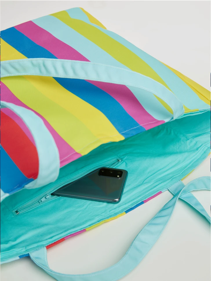 Die Streifen sind schlichtweg unsterblich. Falls du nach einem trendigen Accessoire für diesen Sommer suchst, empfehlen wir dir diese geräumige lustigen Strandtasche. Kombiniere sie mit deinem Lieblings-Badeanzug oder -Sommerkleid – aber denk daran: Sie sollte nur mit einer auffälligen Farbe kombiniert werden. Setze auf Streifen und zeige allen, dass die Modewelt kein Tabu für dich ist.