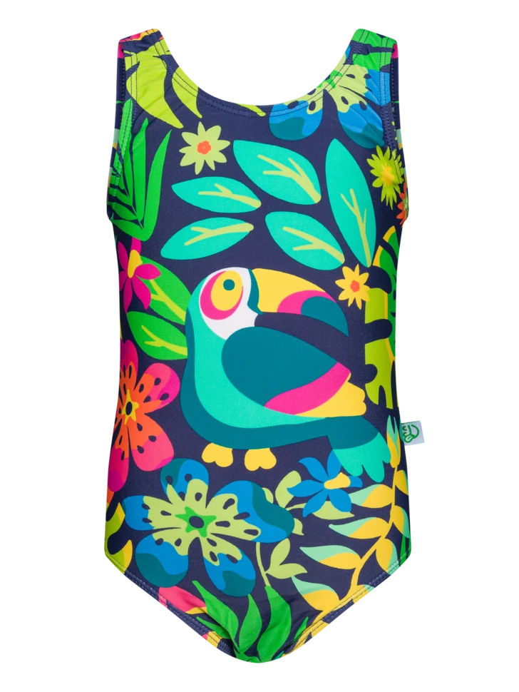 Du kannst unser beliebtes Motiv mit dem Dschungel-Tukan ab sofort auf diesem lustigen Badeanzug für Mädchen finden! Verwöhne deine kleine Prinzessin mit diesem hübschen Muster und lass sie sonnige Tage am Wasser genießen wie noch nie zuvor.