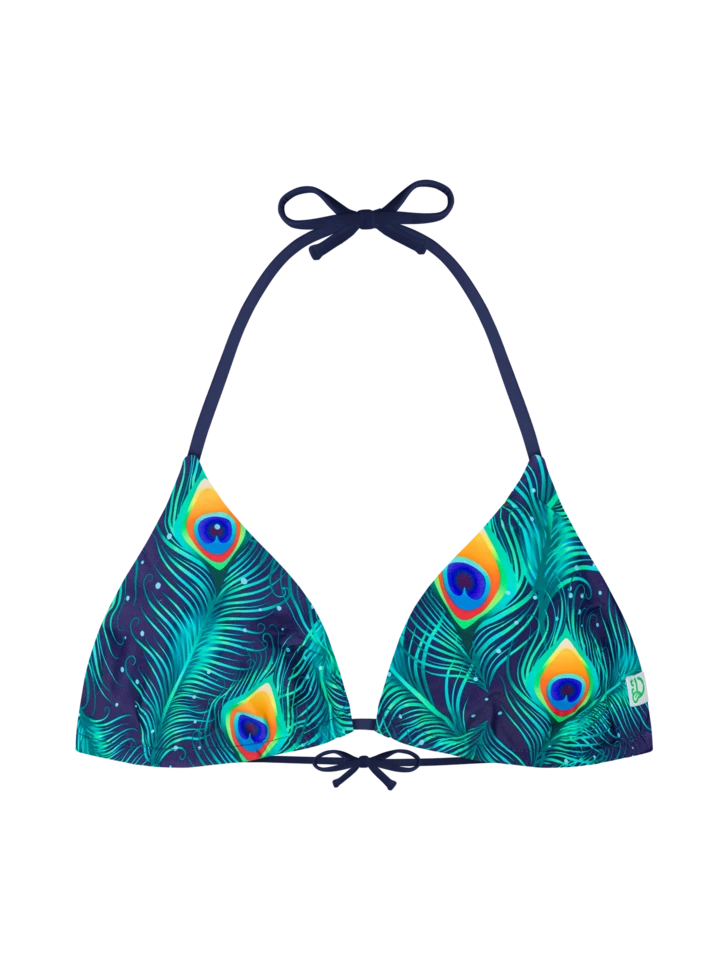Wusstest du, dass es bis zu drei Jahre dauert, bis einem Pfau sein majestätischer Schwanz wächst? Du kannst seine wunderschönen Federn ab jetzt auch an deinem Strandoutfit bewundern. Bereite dir mit diesem lustigen Bikinioberteil in Triangelform mit einem bunten Pfauen-Tanz-Motiv eine Freude.