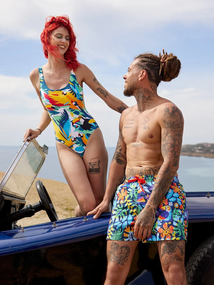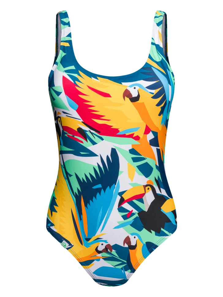 Wusstest du, dass ein blaugelber Ara bis zu 800 menschliche Wörter lernen kann? Dieser intelligente und wunderschöne Vogel schmückt zusammen mit dem Tukan den lustigen einteiligen Badeanzug, der in allen tropischen Farben leuchtet.