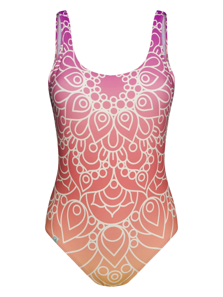 Das sonnige Mandala wird dich mit positiver Energie und Frieden aufladen. Zieh unseren lustigen einteiligen Badeanzug für Frauen mit diesem wunderbaren Motiv an und lass die positive Energie in dein Leben strömen.