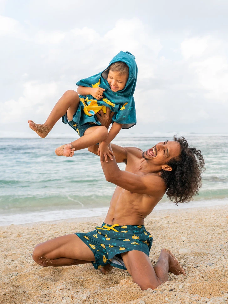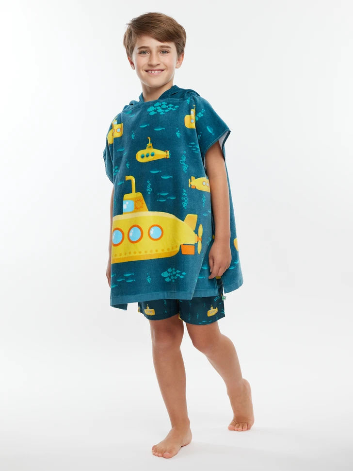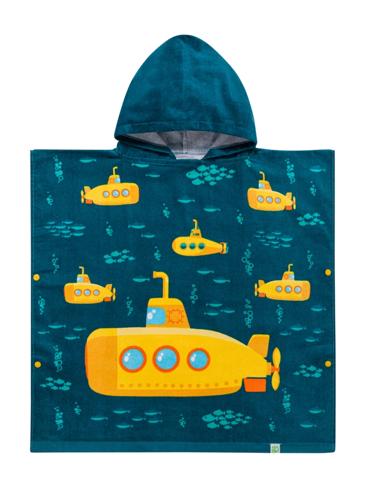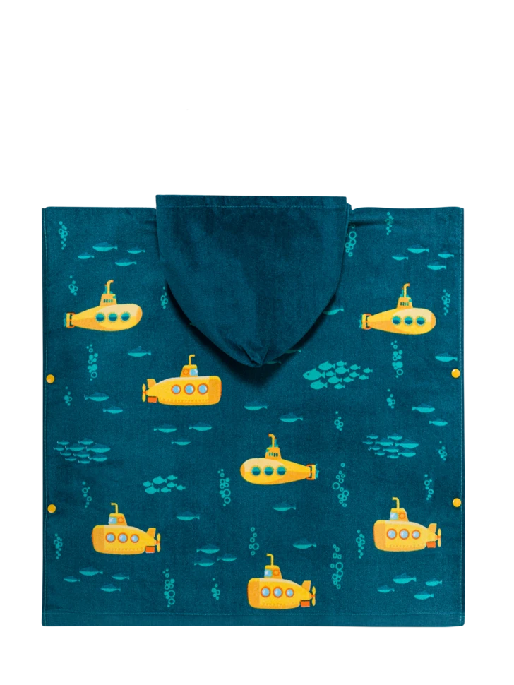 Captain, ich kann links eine Klippe ausmachen! Mag dein Kind auch U-Boote? Dann ist dieser lustige Strandponcho für Kinder mit gelbem U-Boot-Motiv genau das Richtige für ihn. Feine Baumwolle, eine hohe Saugfähigkeit und leuchtende Farben sind genau das, was jede kleine Kapitänin und jeder kleine Kapitän braucht.