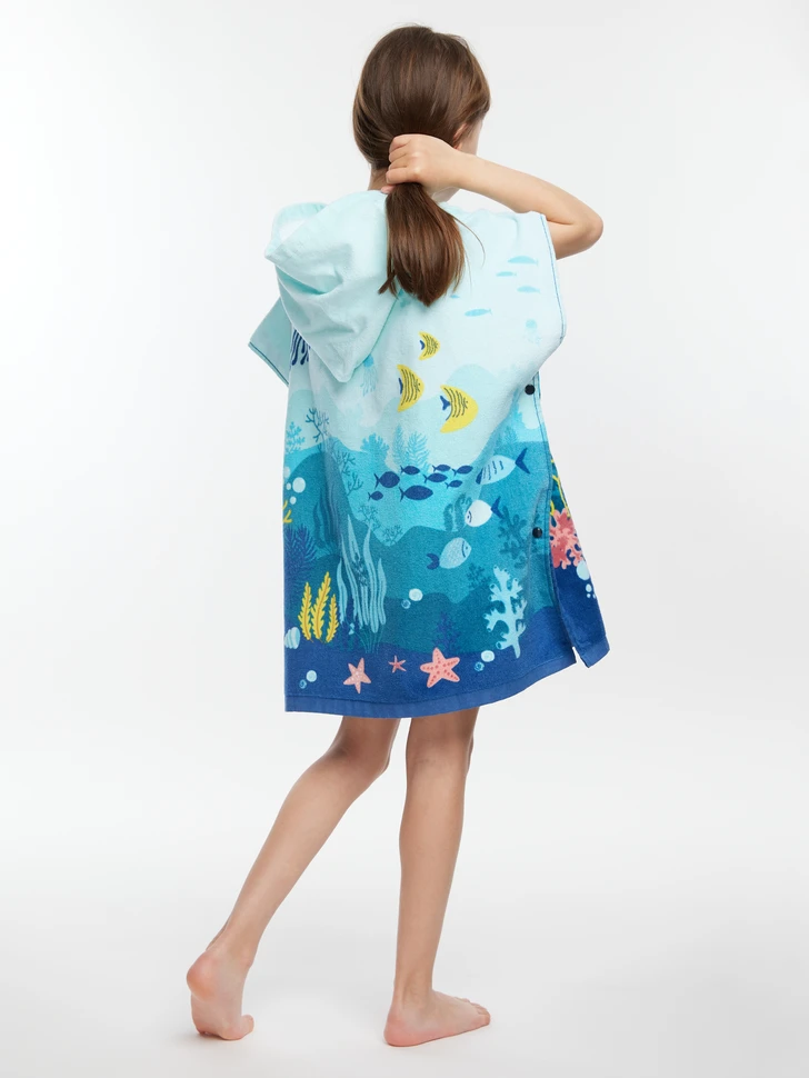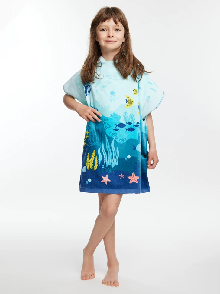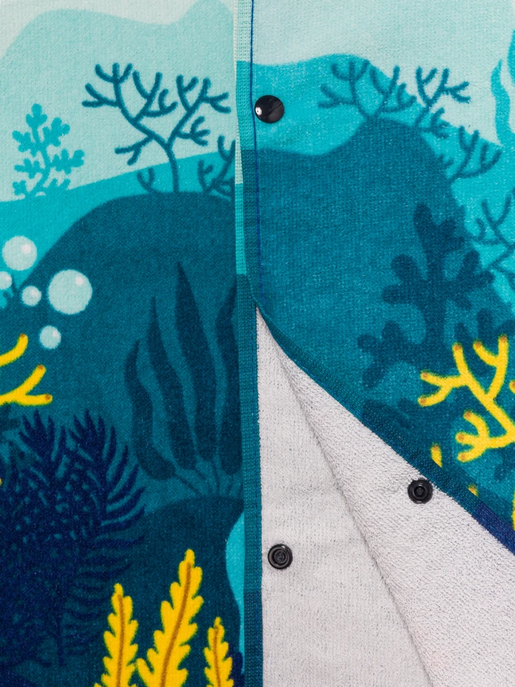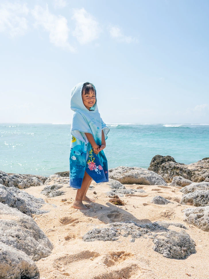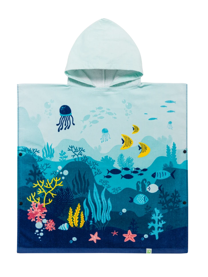 Der Strand und die Unterwasserwelt gehören zusammen. So wie der lustige Strandponcho für Kinder und der perfekte Tragekomfort. Der Poncho saugt das Wasser gut auf, fühlt sich weich an und sein fröhliches Korallenweltmotiv zaubert ein Leuchten in alle Kinderaugen.