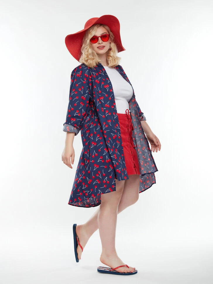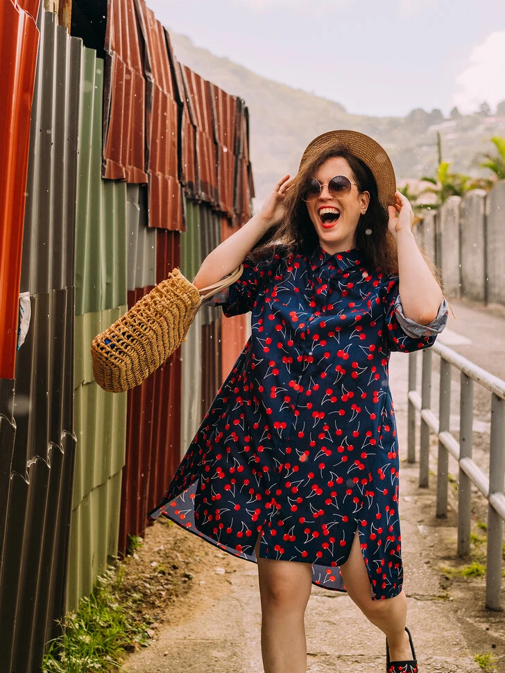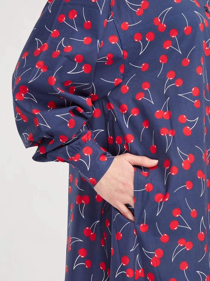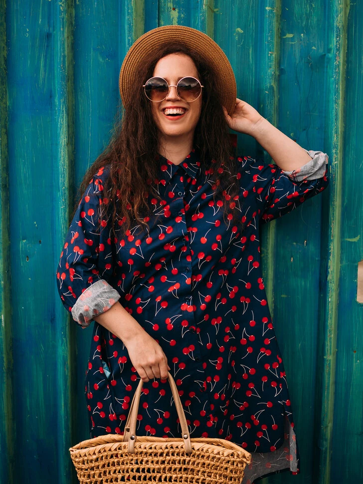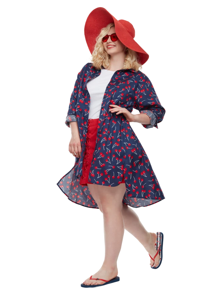 Hast du dir auch als Kind Kirschen an die Ohren gehängt und so getan, als wären es Ohrringe? Dank dieses mit Kirschen bestückten, lustigen Hemdkleids kannst du sie jetzt anziehen.
