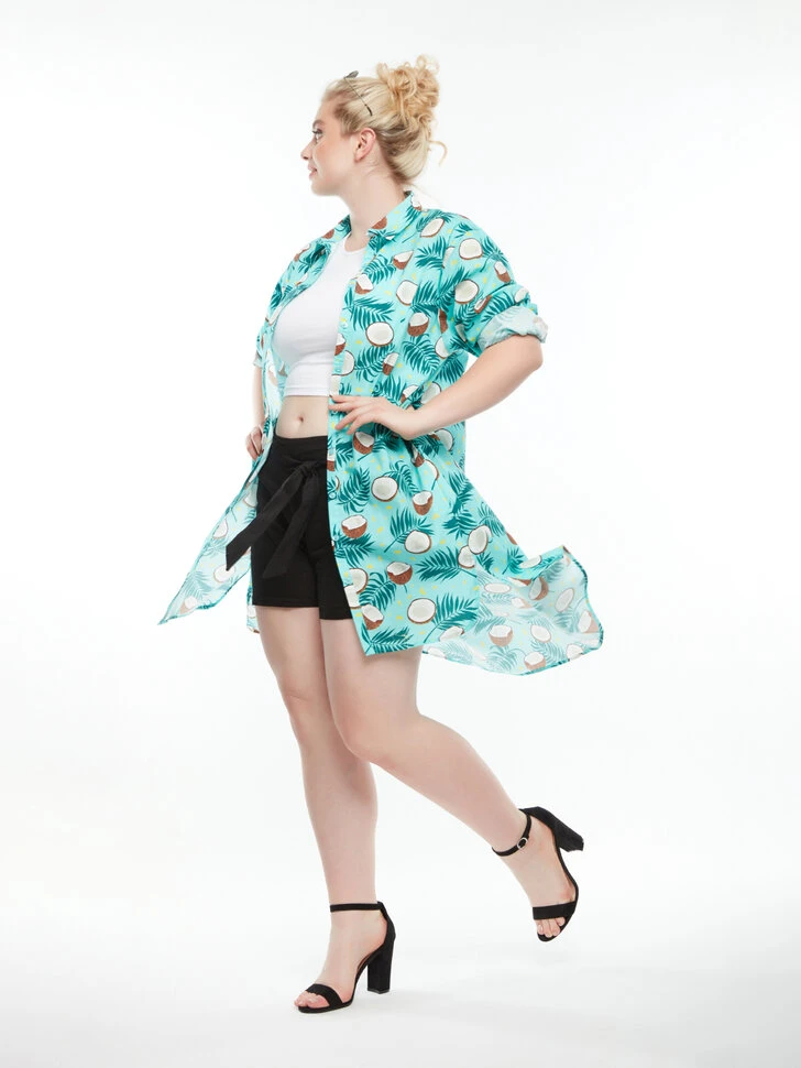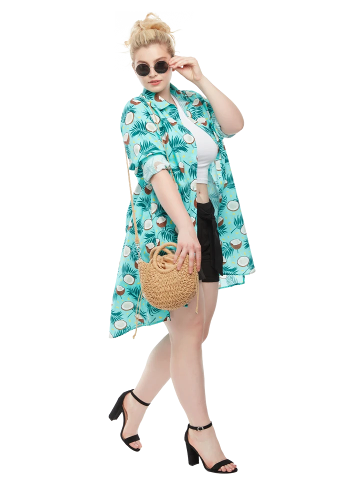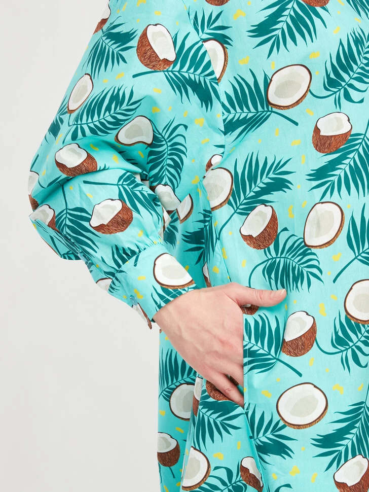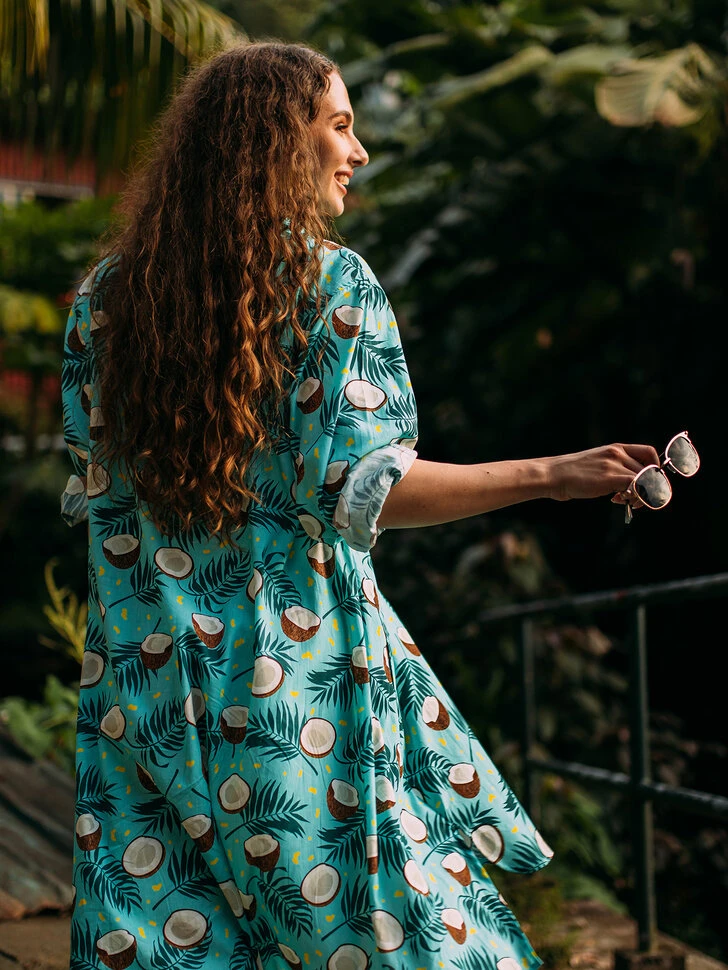 Die Kokosnuss ist prall gefüllt mit leckerem, erfrischendem Kokosnusswasser. Weißt du, was ebenfalls erfrischend ist? Das originelle, lustige Hemdkleid, das deine Sommergarderobe mit Leichtigkeit auffrischen wird.